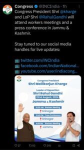 राहुल गांधी और खरगे आज जायेगे जम्मू कश्मीर।